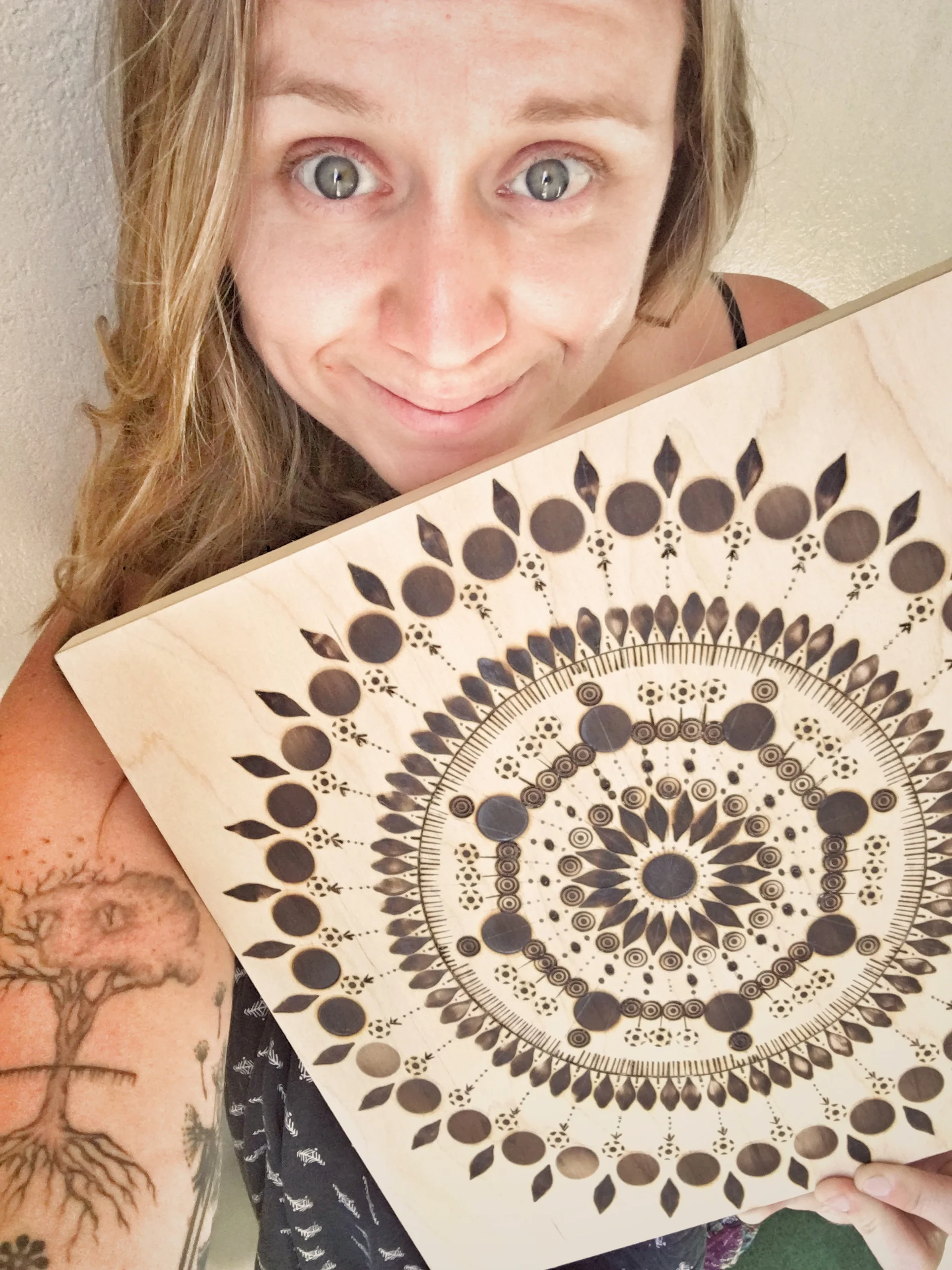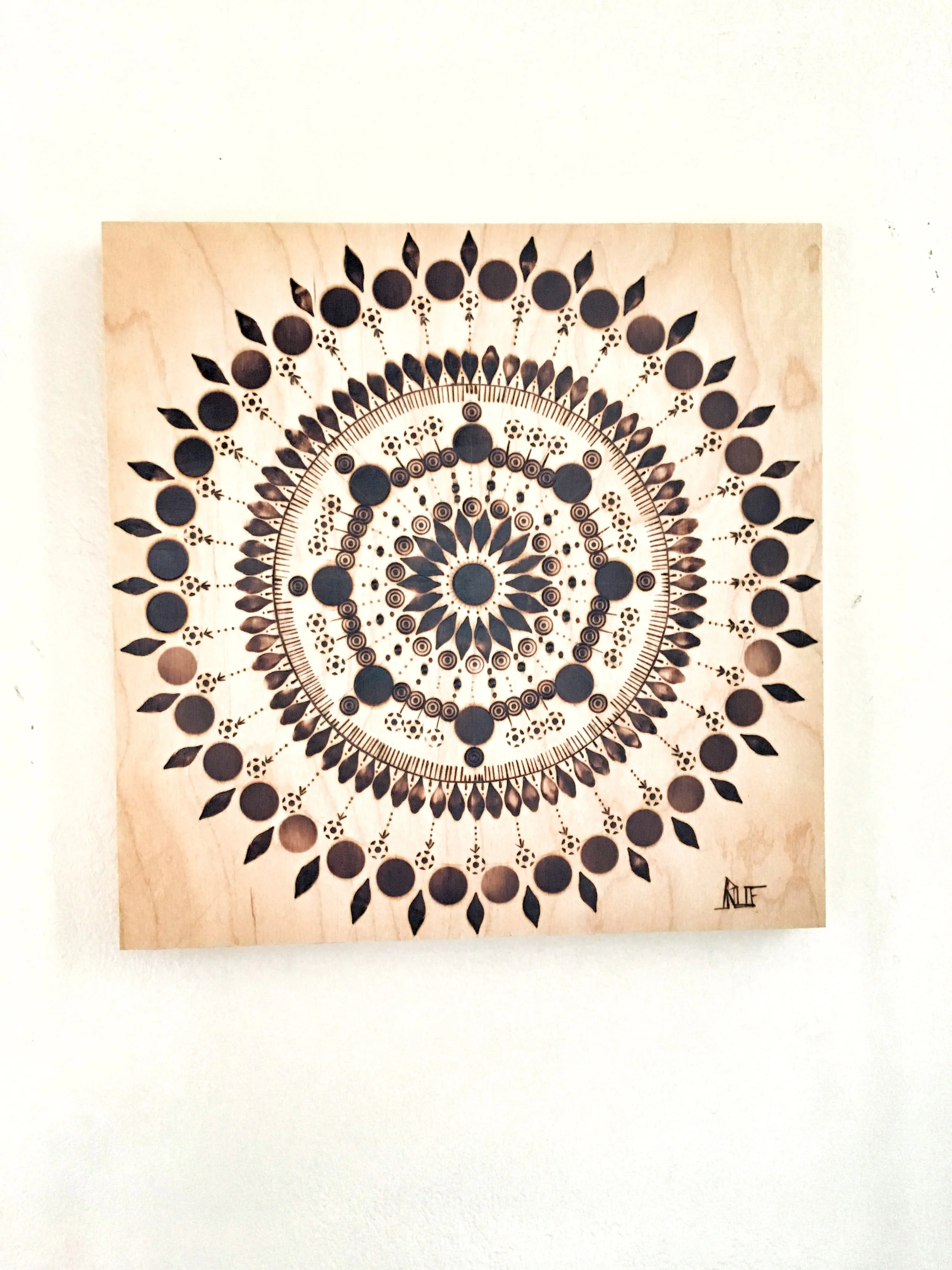 I never use to think of myself as an artist, mainly because I can’t stick to one medium. I see something and feel inspired to try my own spin on it. Or a see a technique and wonder what it would look like with a different subject matter or in a different format. Woodburning is my new favorite medium. This is my first attempt, I didn’t try shading or anything advanced, just took my time making a symmetrical design and then slowly burned in the pattern. I loved the catharsis of it! The slow steady burn and the heat combined to make something beautiful. I don’t think I’ll make prints of these. They’ll remain one of a kind pieces of my soul. This one is currently up at McClains Coffee Shop in Fullerton California. Stop by if you’re a local!